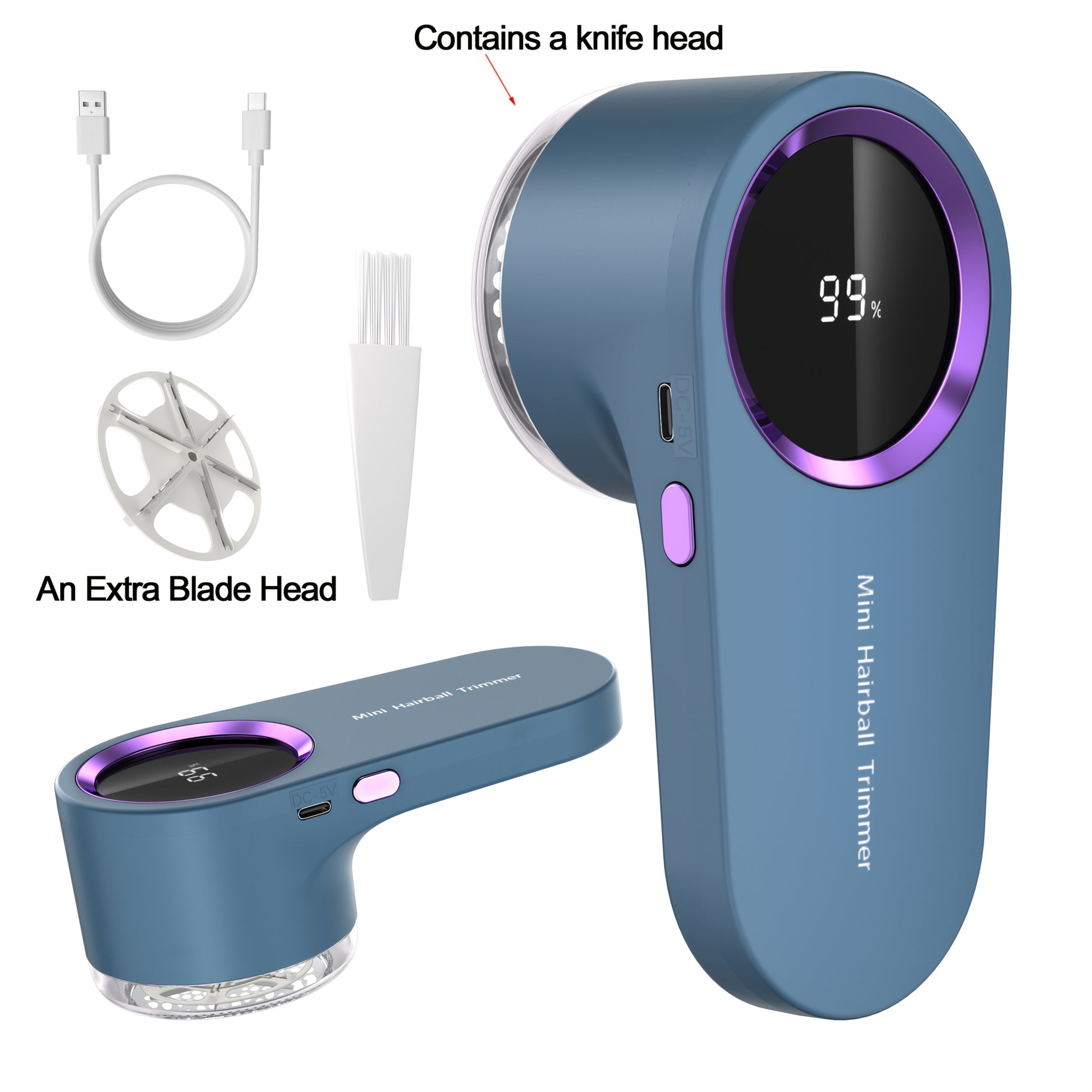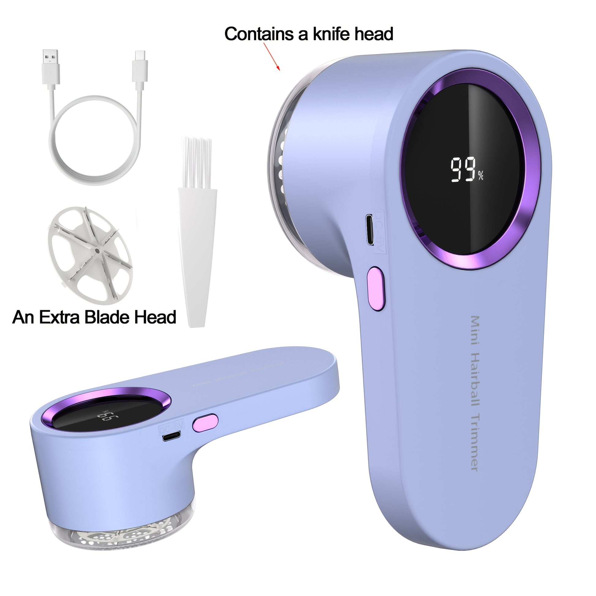 Zawiera jedno dodatkowe ostrze, kabel USB oraz szczoteczkę do czyszczenia. Bateria 500 mAh